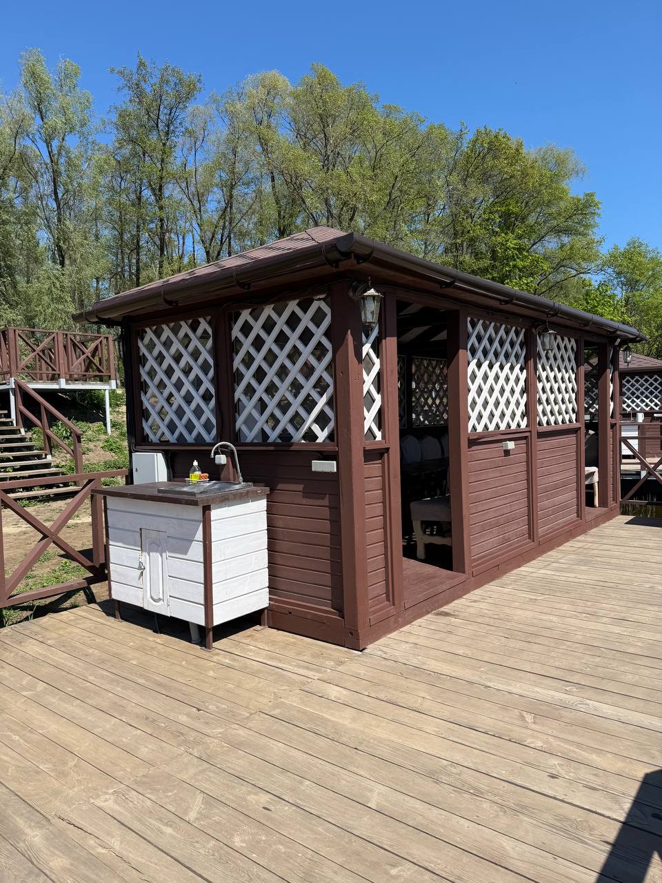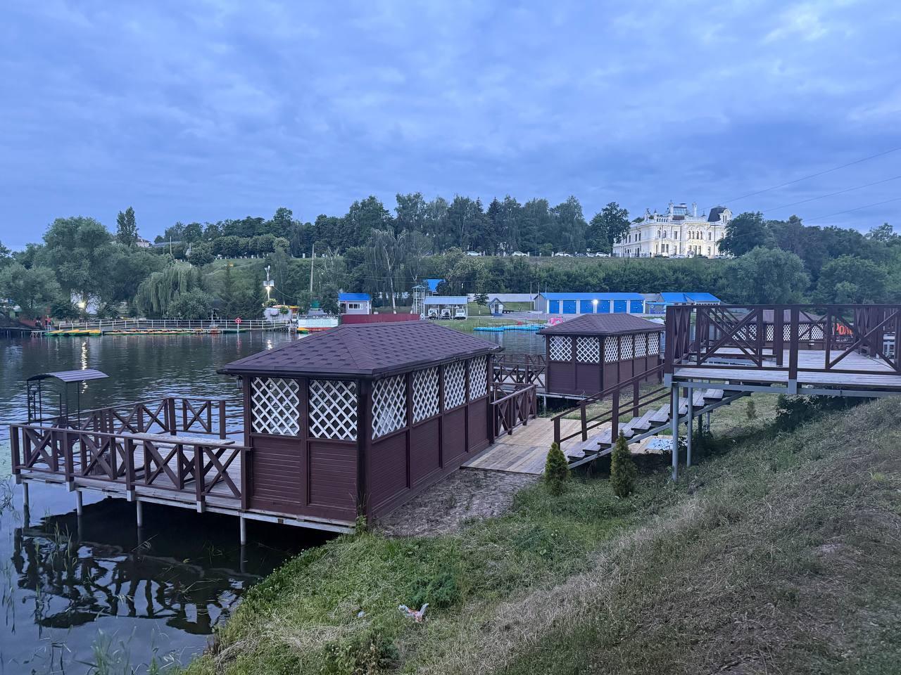 Беседки с мангальной площадкой, как бы парящие над рекой, всё необходимое оборудование для приготовления блюд на углях и огне - гриль-парк готов принять самые разные группы гостей, от маленькой семьи на трёх человек, до большой корпоративной компании!